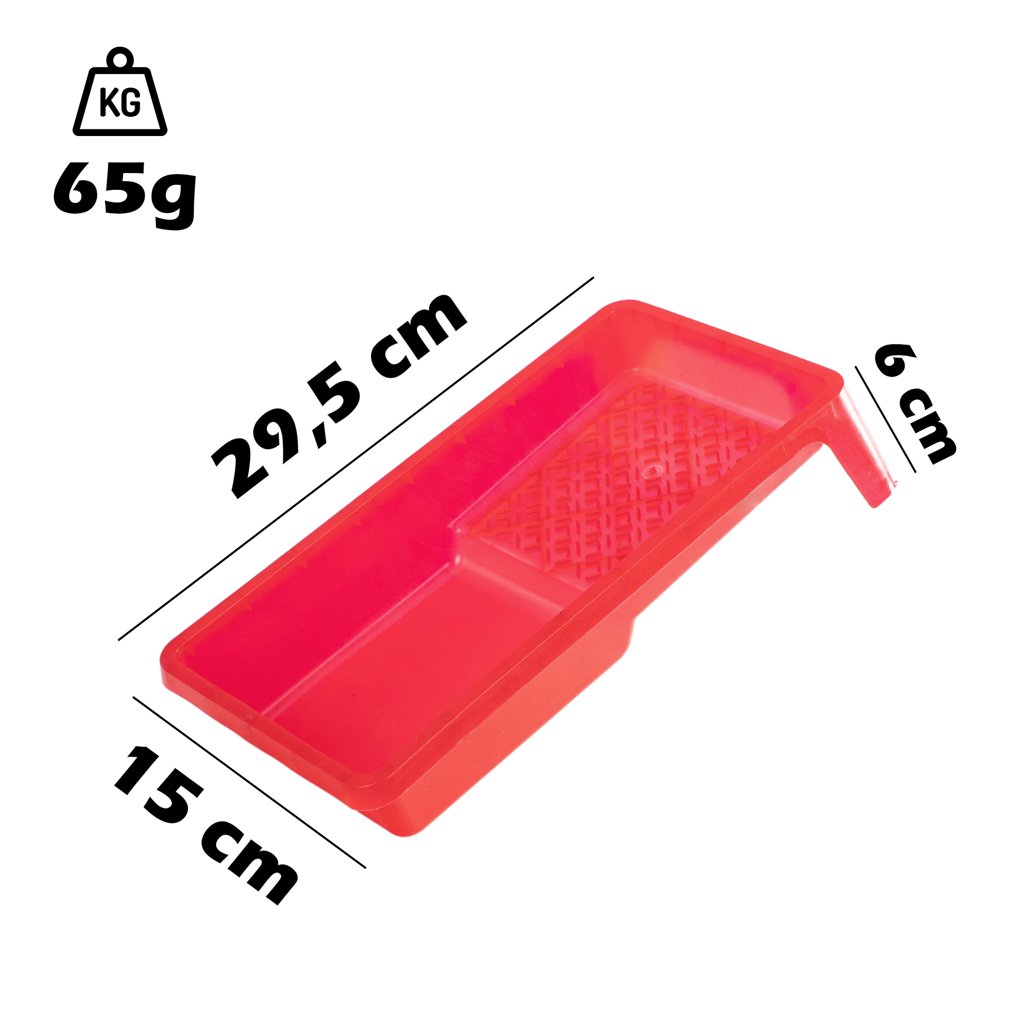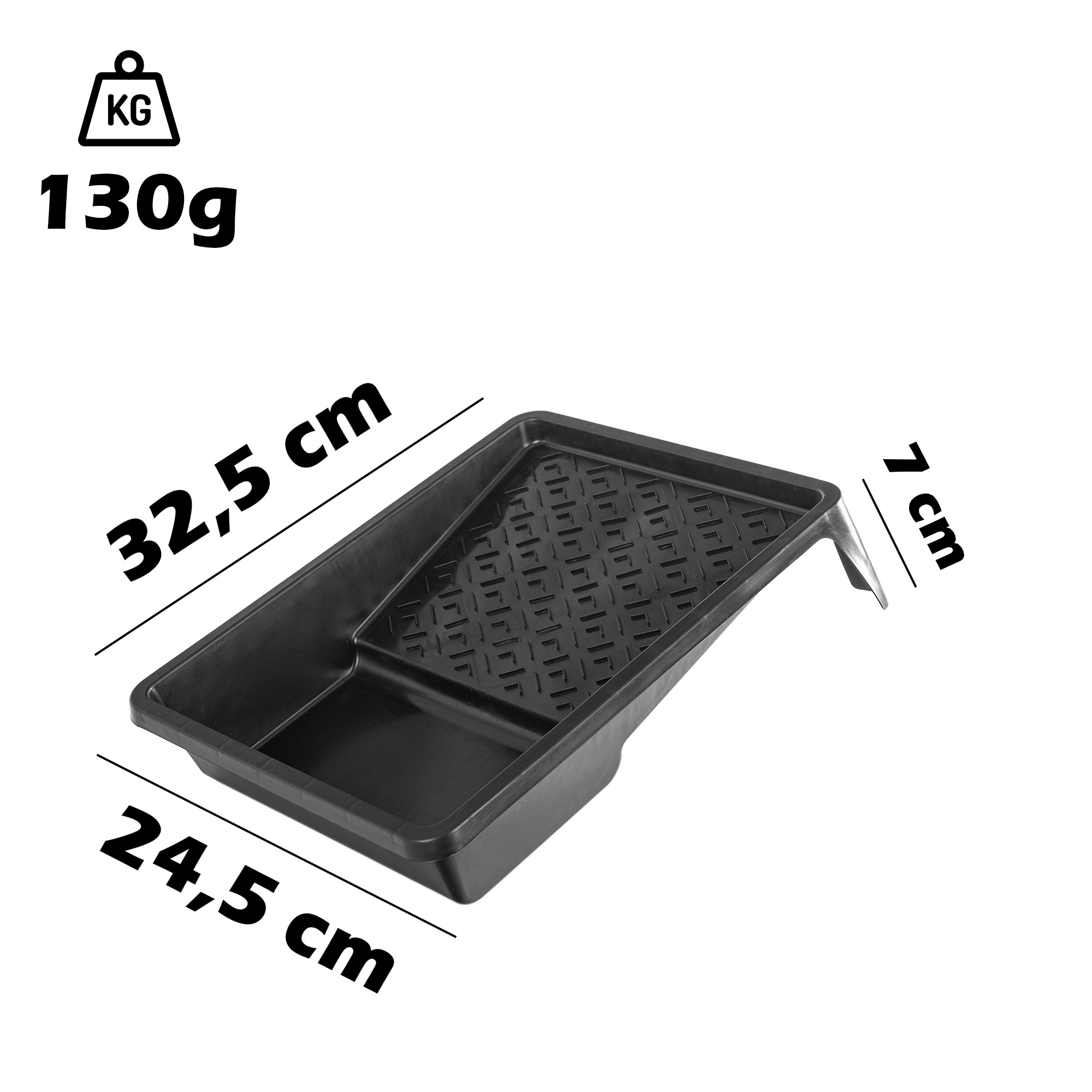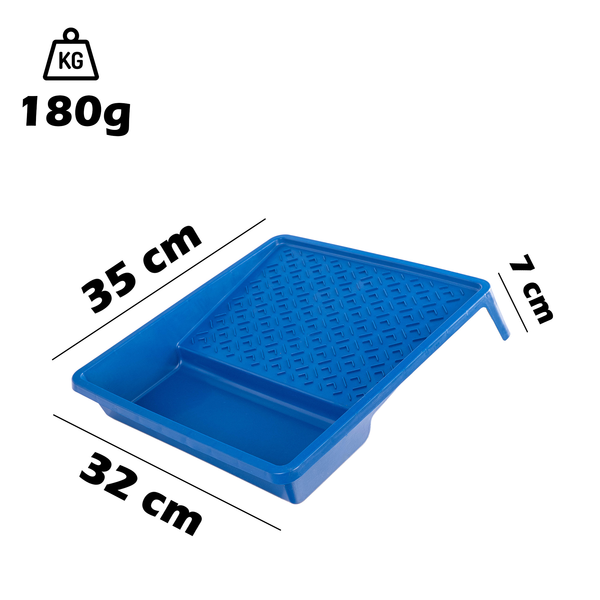 Wykonana z trwałego polipropylenu, odporna na działanie rozpuszczalników i uszkodzenia mechaniczne. Posiada ryflowaną powierzchnię do równomiernego rozprowadzania farby na wałku.