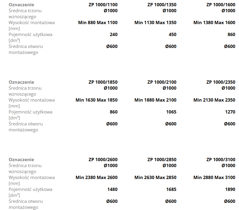 | Średnica trzonu wznoszącego | 1000 |
